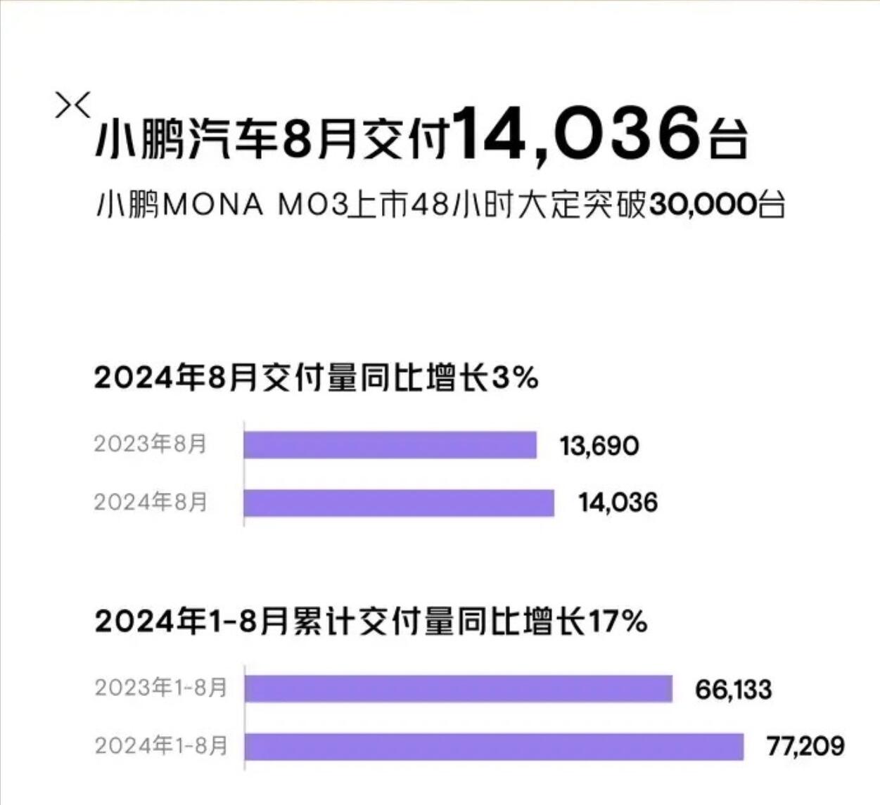 小鹏汽车在8月份再次展现了其坚韧不屈的精神,交付了14,036辆新车,较去年同期增长了3%,这一成绩不仅突破了万辆大关,更体现了公司稳健的发展势头。从年初到八月底,小鹏汽车累计交付的新车数量达到了77,209辆,尽管这一数字引起了市场的关注与担忧,但小鹏汽车并未止步。特别是8月27日,小鹏MONA M03的上市仅用48小时便实现了超过3万台的大定,显示了强大的市场吸引力。这款新车型是否能成为挽救局势的关键角色?市场的反应将是最终的试金石。