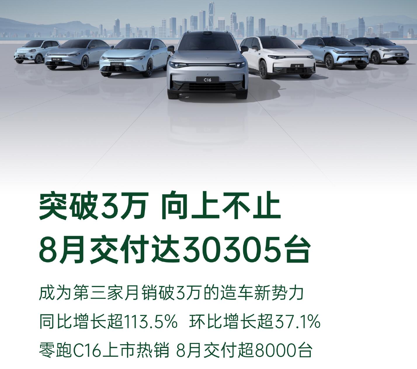 在8月份的车市中,零跑汽车异军突起,成为了一个不可忽视的“黑马”。该品牌在8月的交付量高达30305台,与去年同期相比,增长了惊人的113.5%。在这一成绩背后,零跑C16车型扮演了关键角色,仅8月一个月就交付了超过8000台。虽然零跑汽车在市场中并非始终处于聚光灯下,但其稳健而坚定的步伐,以及主打性价比的战略,已经让它在竞争激烈的市场中脱颖而出。