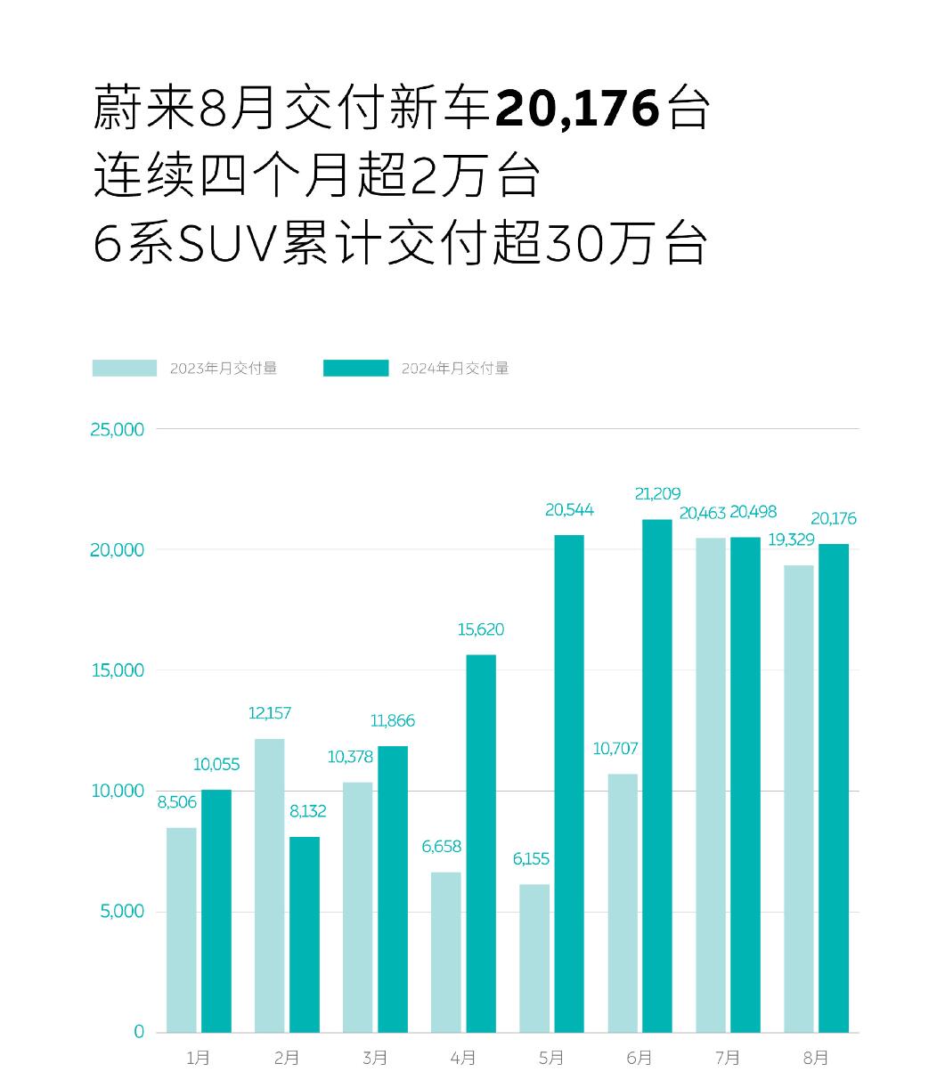 蔚来汽车的市场表现持续走强。在9月1日,通过微博公布的数据显示,8月份蔚来交付量达到20,176辆新车,连续四个月突破两万辆大关。从1月至8月的总交付量为128,100辆,同比增长了35.77%。此前,市场对蔚来的担忧似乎有些过虑,如今,其稳定的市场表现正逐渐消除这种疑虑。此外,8月30日在成都车展的发布会上,蔚来还公布了川藏换电线路的开通计划。