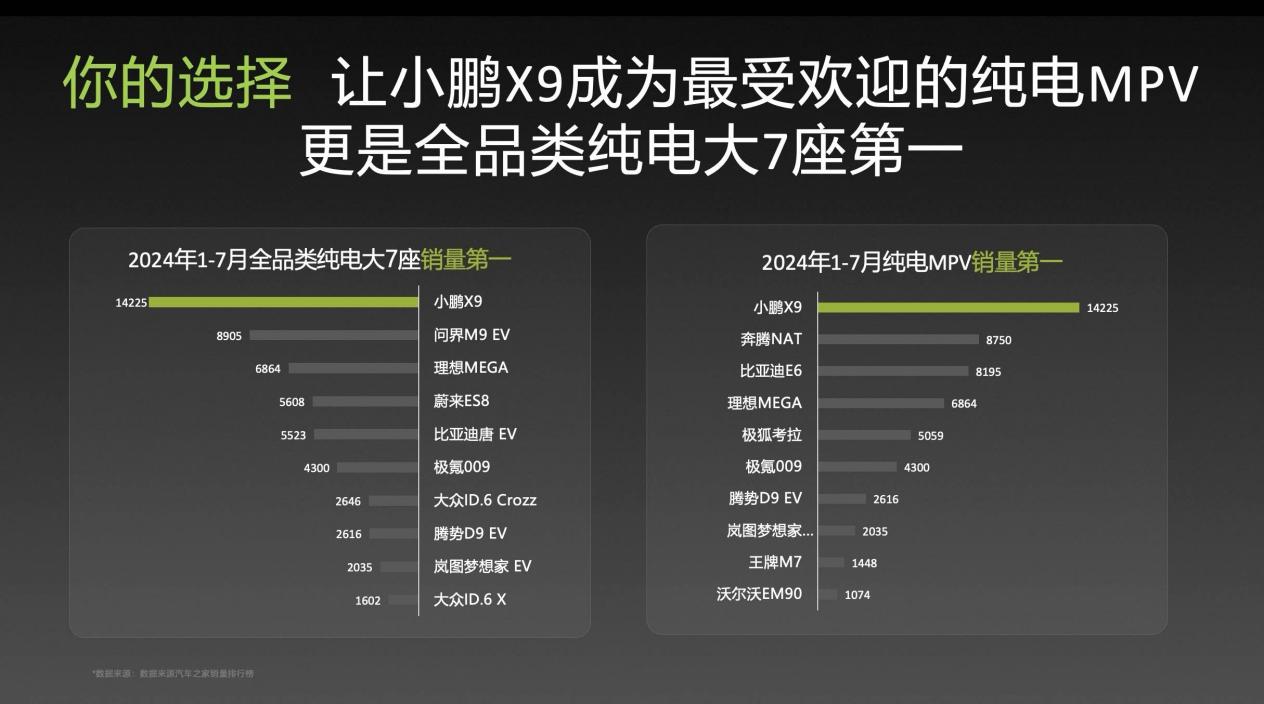 随着市场竞争的加剧,市场从以卖方主导转变为买方主导,客户需求呈现出更加多样化的趋势。在这样的背景下,针对家庭用户设计的小鹏X9表现突出,连续七个月在全品类大七座车型销量中排名第一,同时在2024年前七个月的纯电MPV销量中也位居榜首。这一成绩不仅推动了高端纯电MPV领域进入了一个以家用需求为核心的新时代,而且,在商务用车领域,极氪009的销量也持续上升,成为了高端纯电MPV中的“新商业选择”。这两款具有明显差异化的纯电动MPV车型,几乎完全占据了高端MPV市场的全生态位。