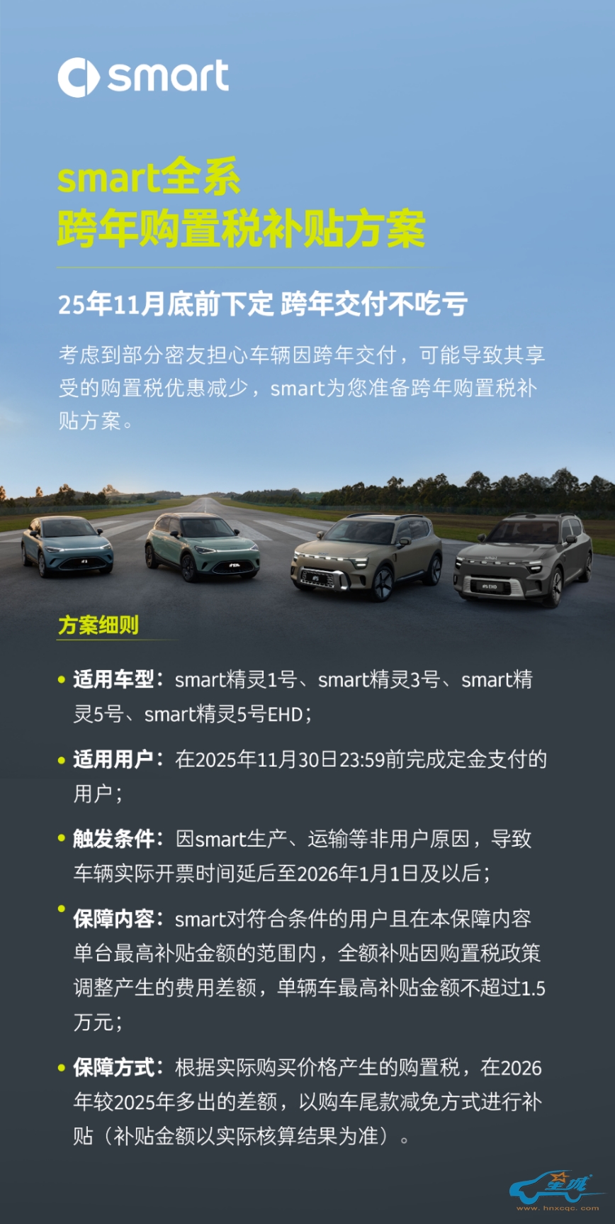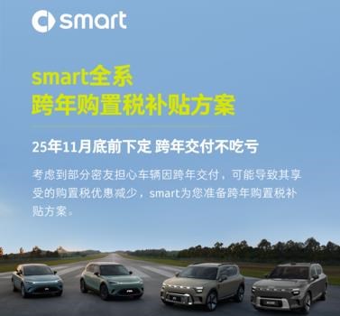 即日起,选购smart #1、#3、#5、#5 EHD超级电混车型,并在2025年11月30日(含)前完成定金支付的用户,如因非用户原因导致车辆实际开票时间延后至2026年1月1日及以后的,smart将在最高额补贴范围内全额补贴因购置税政策调整产生的费用差额,单辆车最高补贴金额不超过1.5万元。