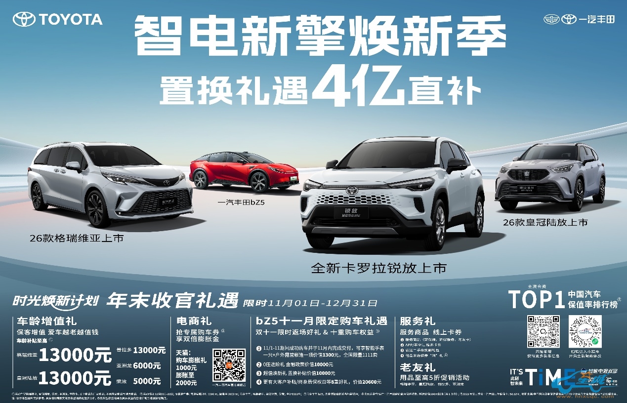 不止如此,为回馈用户厚爱,一汽丰田年末收官礼遇再升级,以4亿元厂家直补正式开启“智电新擎焕新季”。11月1日-12月31日,皇冠陆放、格瑞维亚、普拉多等重磅车型可享至高1.3万元的车龄增值礼;购全新bZ5更有限时购车福利赠送,此外“焕新季”还准备了电商礼、老友礼、服务礼等多重大礼,以极致诚意为用户创造最佳购车时机。