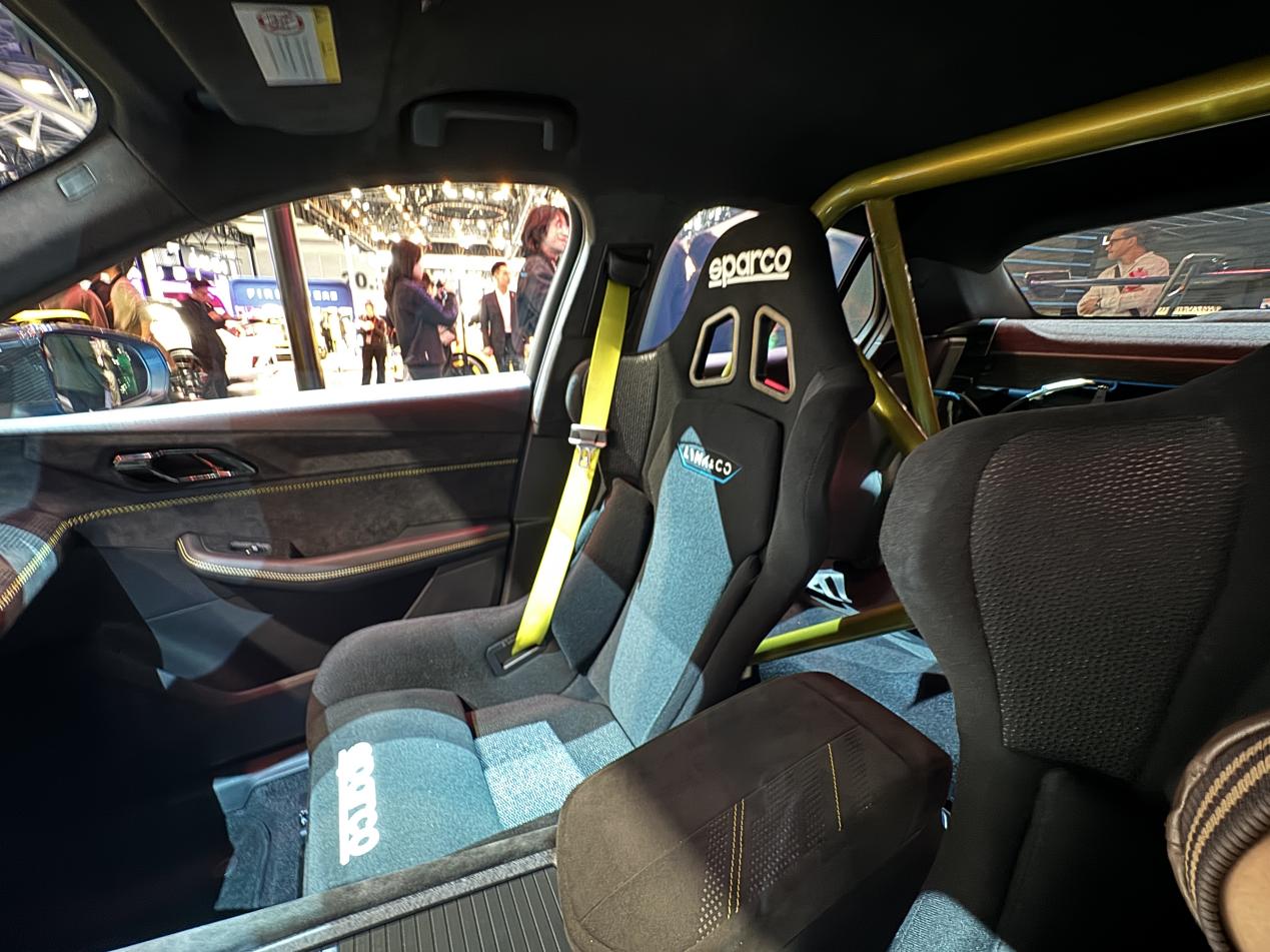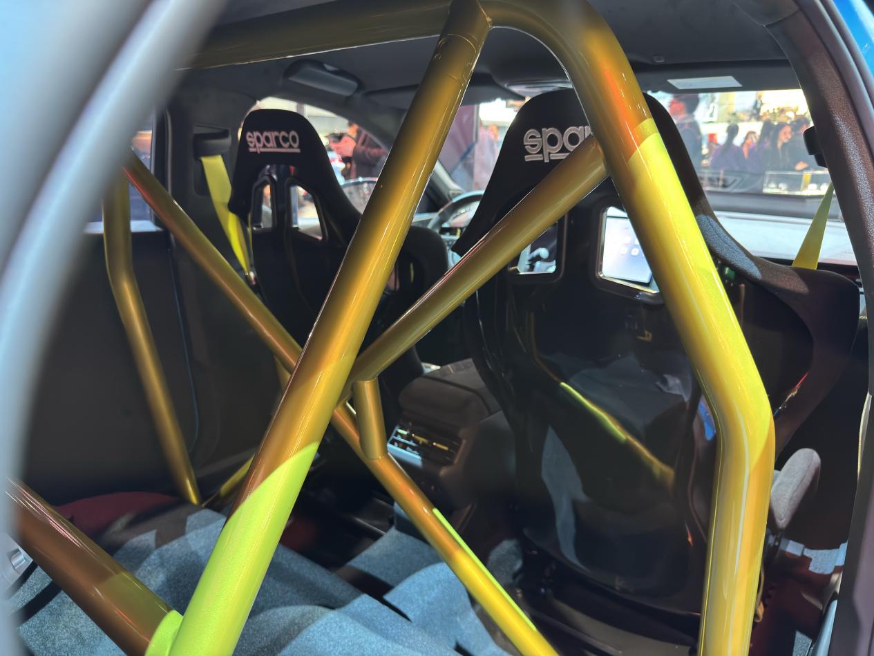 进到车内,首先映入眼帘的是特别粗壮的防滚架,若是专业赛车,防滚架会延伸到驾驶席前方,对于这辆车来说,防滚架更大的作用是装饰,所以,它只安装在后排。这样一来,后排就失去的乘坐的功能。跟拉力赛车一样,这辆车只有主驾驶和副驾驶可以坐人。