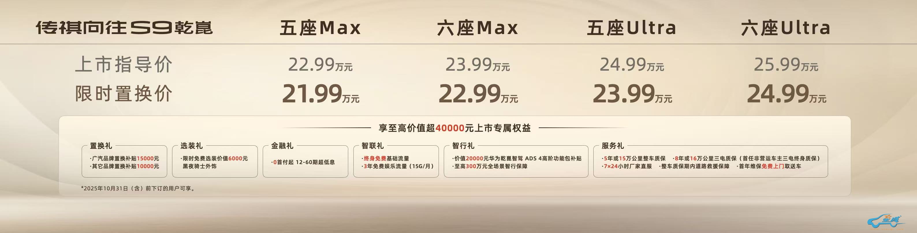 市场指导价22.99万元起(限时置换价21.99万元),还可享至高价值超4万元上市专属权益,包括2万元的华为乾崑智驾ADS4高阶功能包及至高300万元全场景智行保障等。