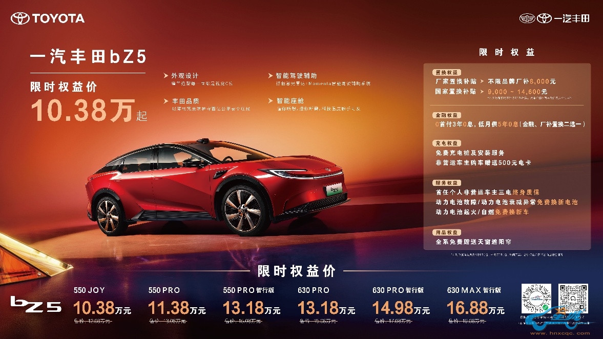 纯电车型bZ5在4月推出限时权益加码,置换权益升级为不限品牌厂补8000元,更可叠加9000-14600元的国家置换补贴,550JOY车型叠加厂补及国补后,限时权益价低至10.38万元。金融权益也是诚意满满,0首付3年0息,低月供5年0息,降低购车门槛(置换、金融二选一)。同时匹配免费充电桩、500元电卡、非营运车主三电终身质保及电池三兜底保障政策,为后续用车提供安心保障。4月购车用户还可免费获赠天窗遮阳帘,舒适加倍。