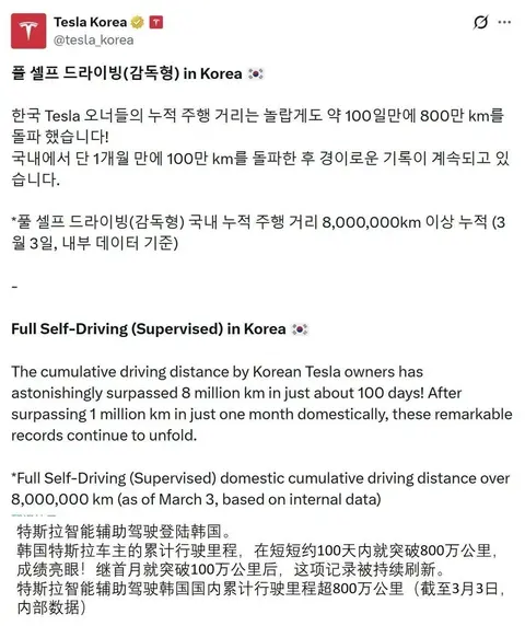 - 特斯拉智能辅助驾驶在韩国上线100天时间内,累计行驶里程已突破800万公里。据了解,该功能上线首月,当地车主行驶里程就已突破100万公里。