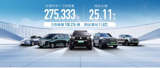 长城汽车3月销售超10万辆 一季度累计销量超27万辆