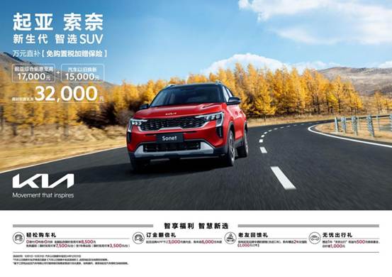 综合钜惠高达1.75万元 起亚索奈/奕跑限时购车直补活动